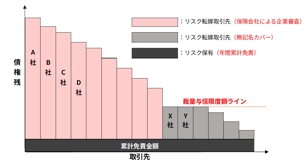 小口新規取引先については「裁量与信枠」内で無記名で登録し、裁量与信枠を超える債券残高を有する取引先を個別に与信枠設定。