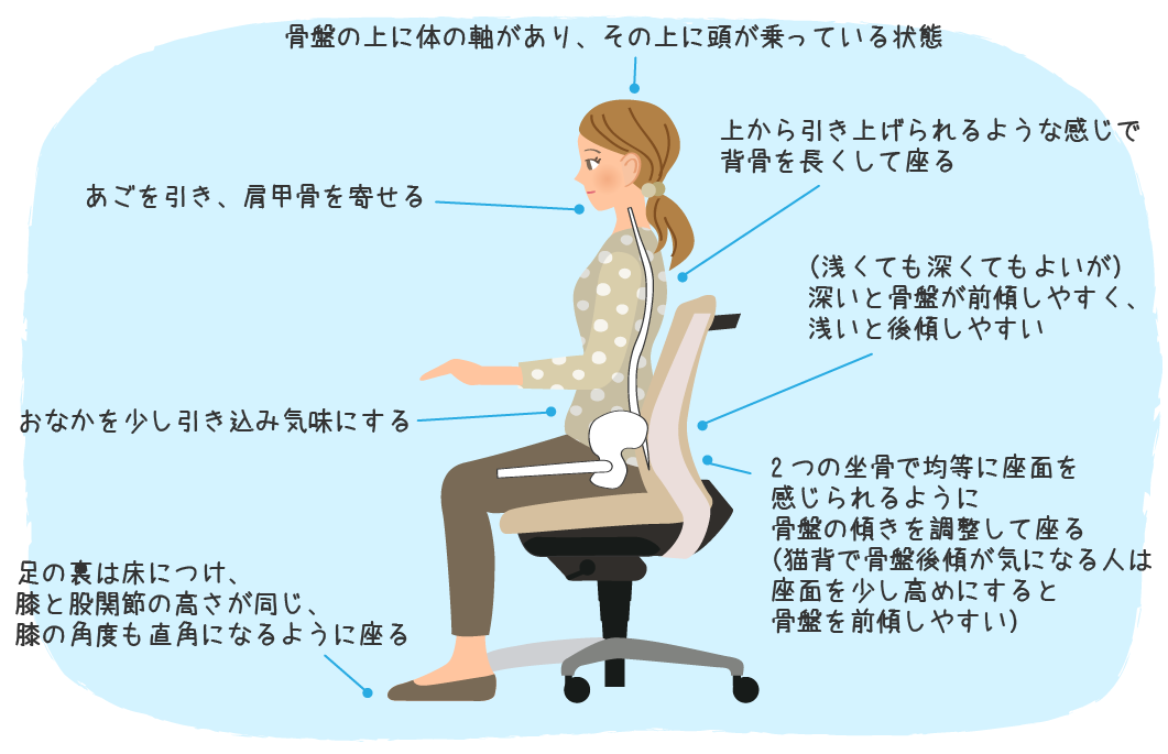よい座り方であっても、「同じ姿勢をずっと続けない」ということも大切です。重心を移動したり、モゾモゾと動くことも体の負担を減らすには効果的です。骨盤の傾きをニュートラルゾーンの中で頻繁に動かすのもよいでしょう。