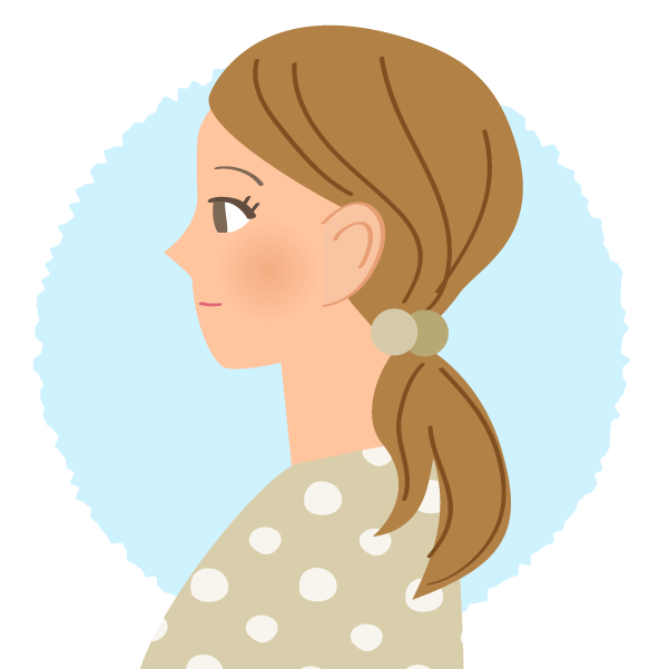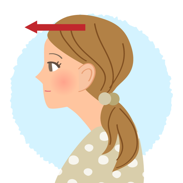 ③肩の位置を変えないように、あごと頭部を水平に後ろに引く。(頭がうなずくように前に傾くと首の骨を支える頸長筋が働かない。視線をまっすぐ、あごを軽く指で押してもよい)